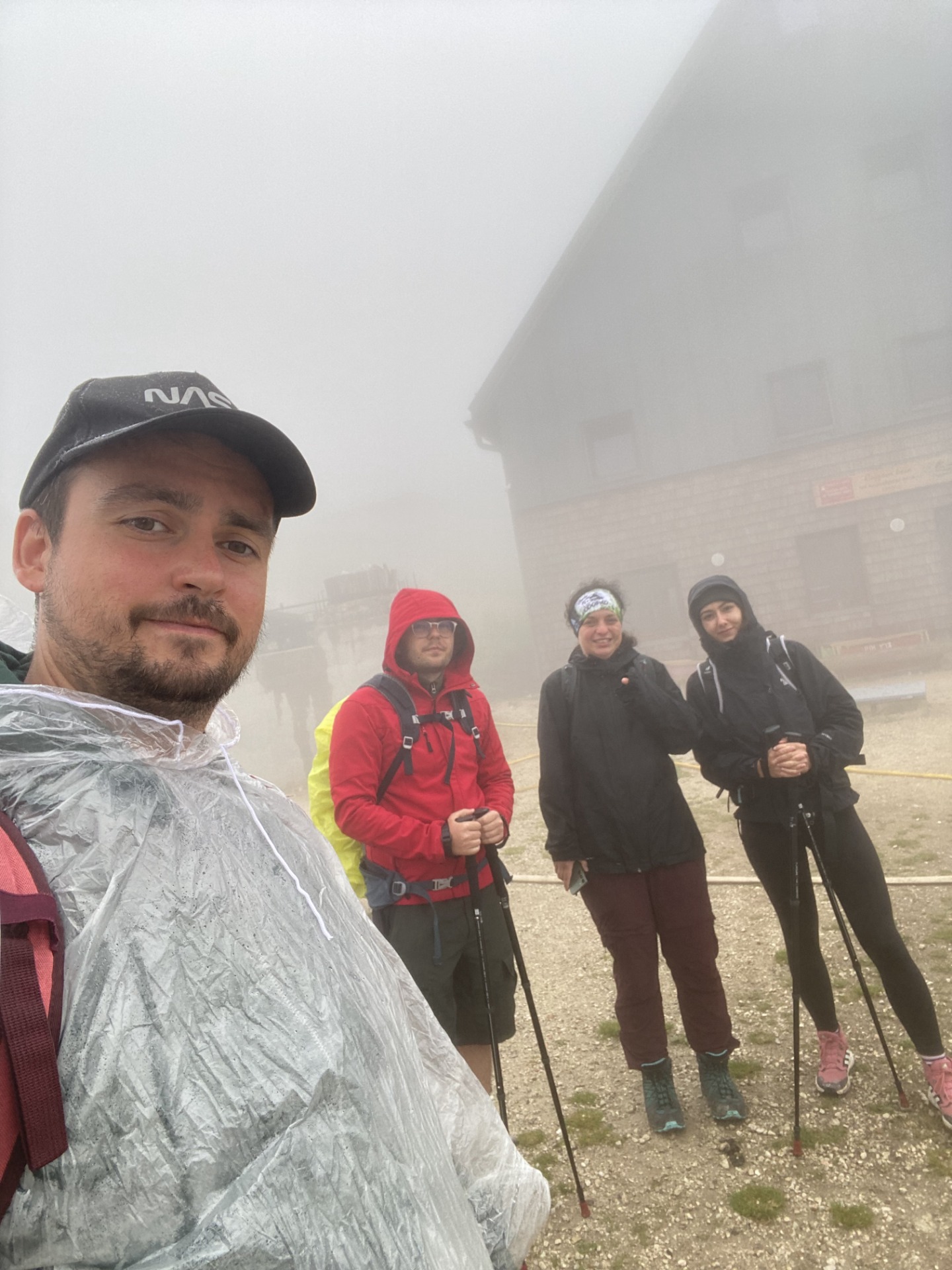 Ozvali sa prvé hromy. Boli sme priamo v oblakoch – keď niekde udrel blesk, celá obloha sa rozžiarila bielym svetlom. Mrholenie sa zmenilo na dážď a v tom nečase sme ešte asi 30 minút stúpali, kým sme konečne dorazili k vytúženej chate.